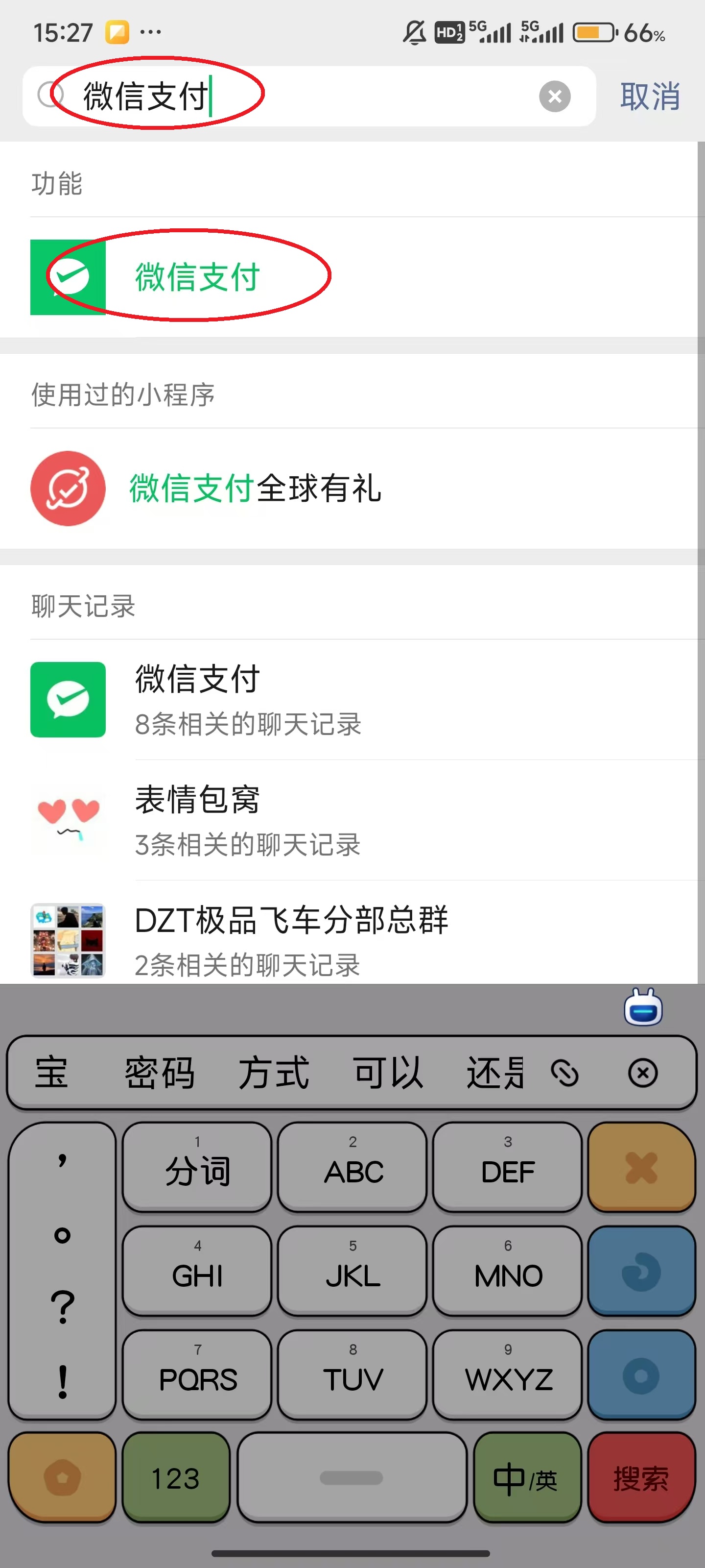 2、輸入“微信支付”,隨后點擊顯現出現的“微信支付”。